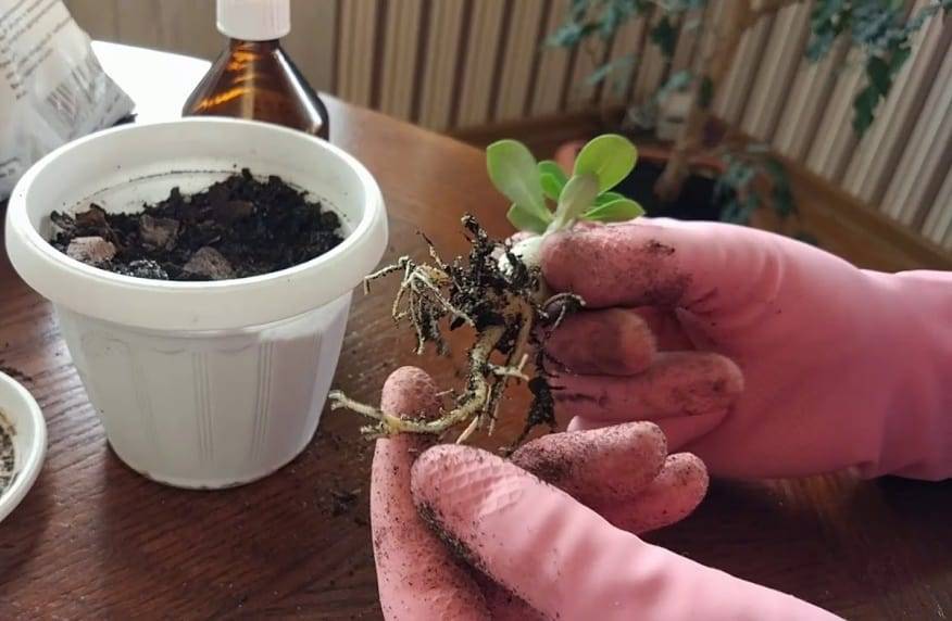 Когда будет проводиться очередная пересадка, растение следует немного приподнять. Нельзя слишком быстро приподнимать корешки, иначе адениум будет болеть.