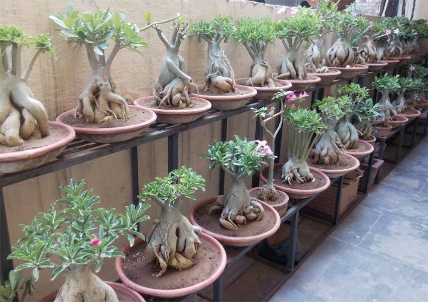 Селекционерам удалось вывести несколько видом мини-адениумов, которые в комнатном цветоводстве формируются в виде бонсай. Эти карликовые деревца очень медленно растут, а крона способна самостоятельно формироваться, поэтому обрезка, как правило, не нужна. Цветут только взрослые растения, возраст которых не менее 3 лет.