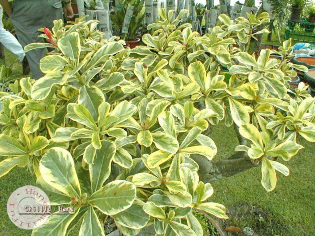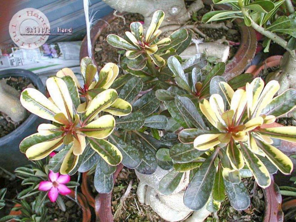 Из-за ослабленной корневой системы адениумы-вариегаты в целом отличаются более компактным размером кроны и каудекса. Ничего не поделать, придется смириться. Тем не менее, некоторые вариегатные сорта стабильно показывают хорошие показатели роста. В числе их отметим тайский сорт Саранья Кэу (Zaranya Kaeo) с зелено-желтой вариегатностью и простыми ярко-розовыми цветками.
