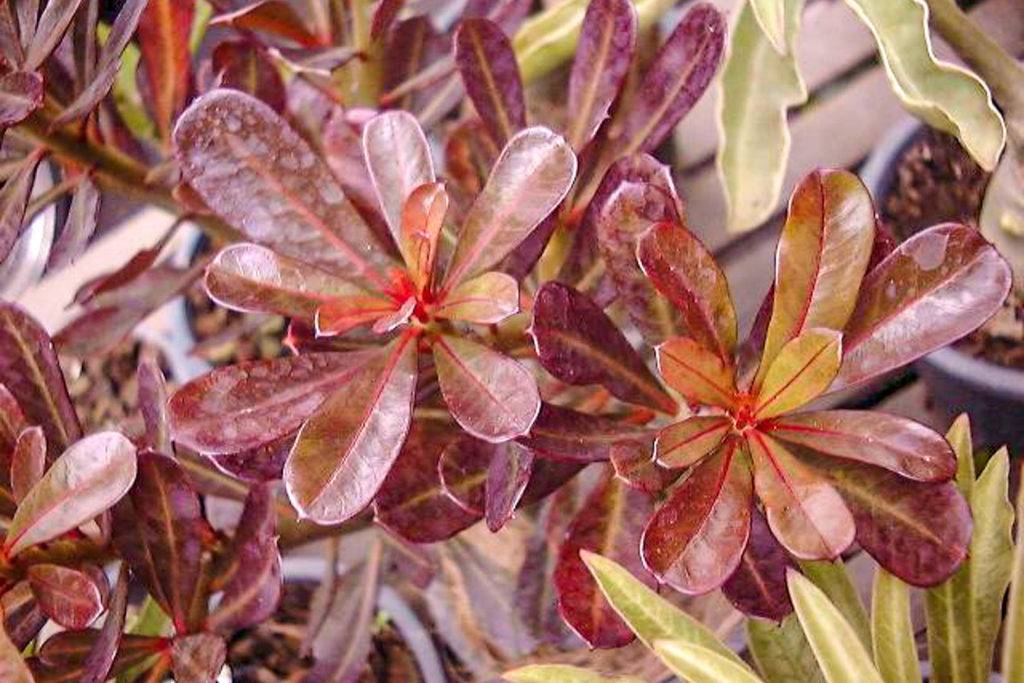 Есть адениумы с зеленым листьями с красными прожилками, а также трехцветной зелено-желто-коричневой вариегатностью.