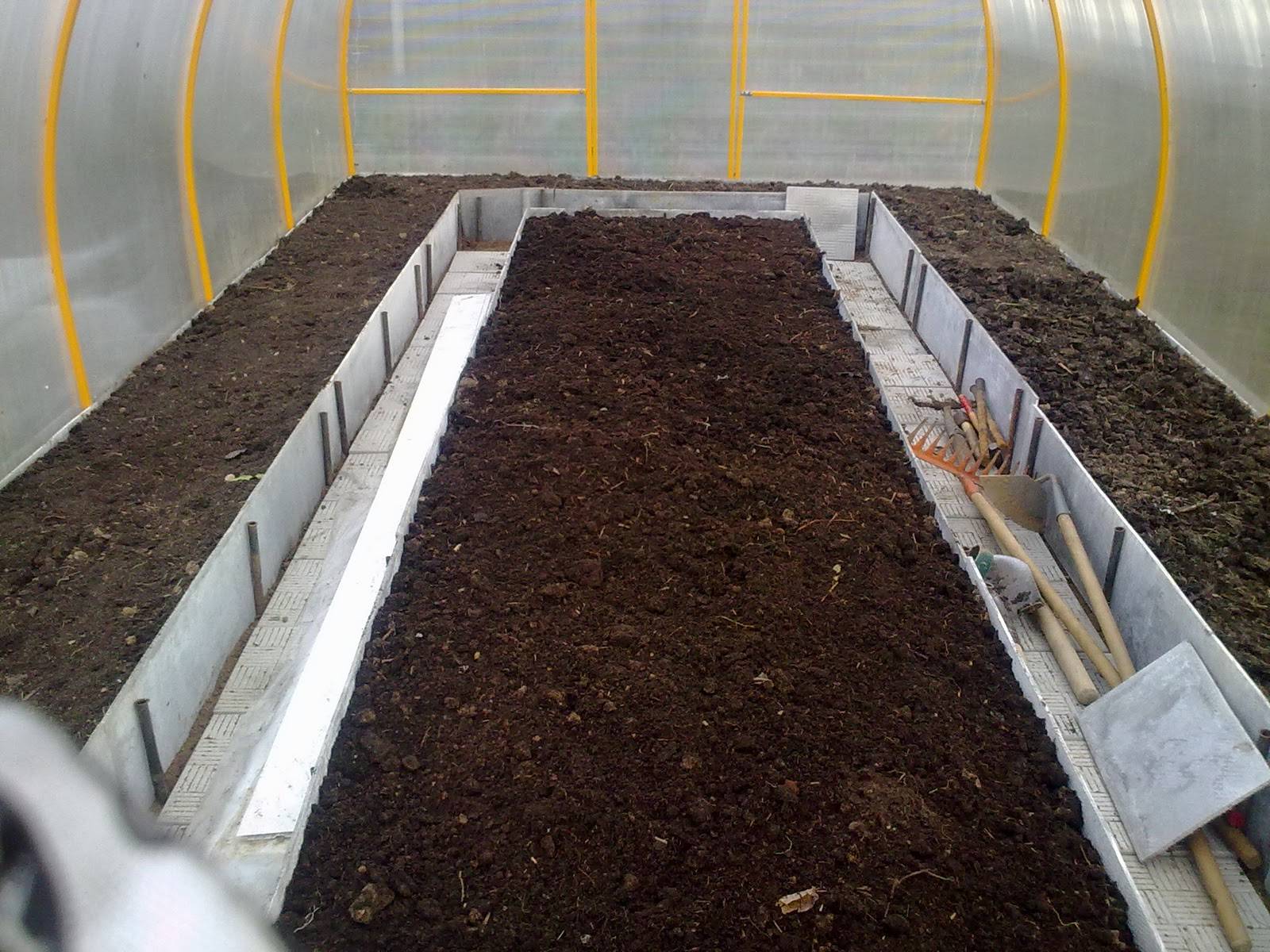 Выращивание баклажанов в теплице начинают с подготовки грунта. Его очищают от остатков растений, обеззараживают с помощью раствора медного купороса (60 г вещества на 10 л воды), несколько раз поливают водой, перекапывают и рыхлят. Почву обогащают органикой — коровяком или компостом (1⁄2 ведра на 1 м²) и комплексными минеральными удобрениями. Нужно учитывать, что посадочная земля должна быть прогрета до 15 °С, а воздух до 18-20 °С.