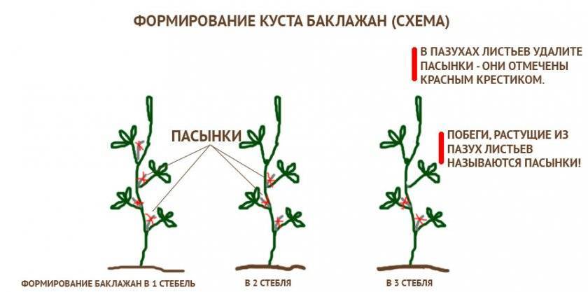 Известно сразу несколько способов для формирования кроны баклажана, это так называемые методики обрезки в один, два, три стебля и более. Такой подход даёт возможность сформировать изящную крону, в зависимости от физиологических особенностей каждого отдельного сорта, а также добиться быстрого вызревания урожая