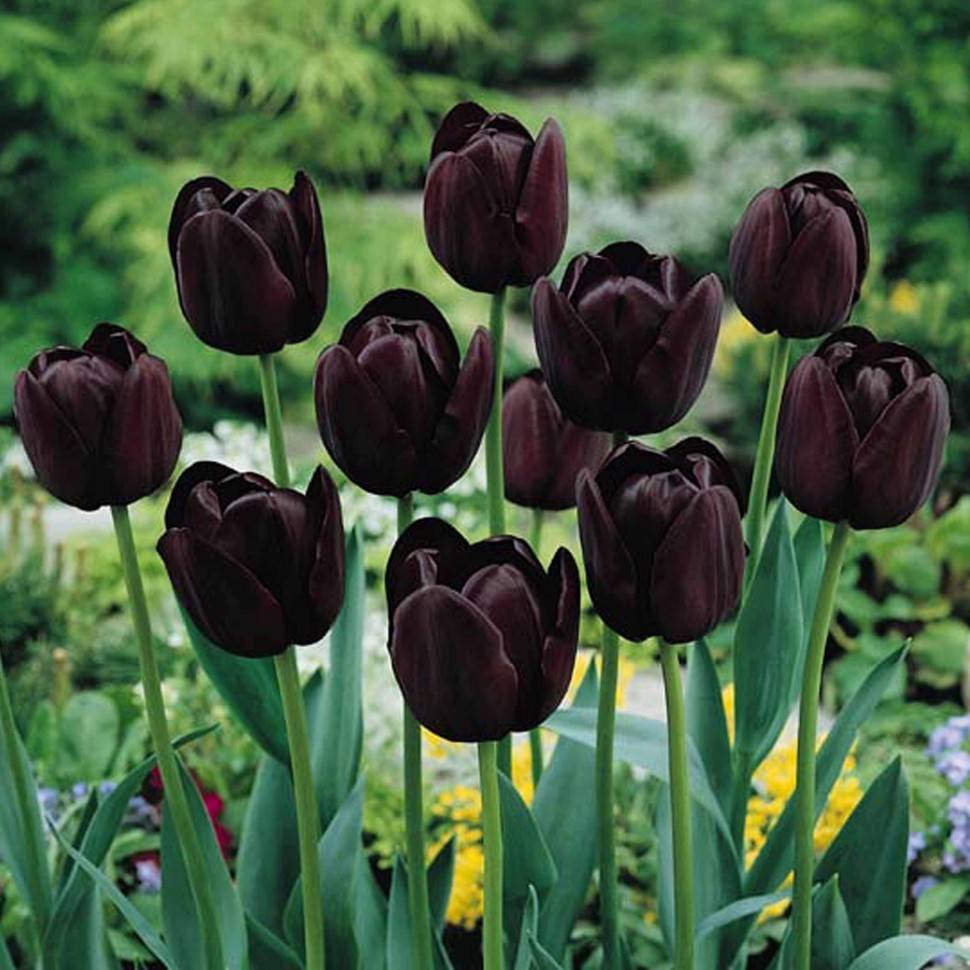 Чёрный тюльпан можно сочетать и с хостами, молочаем, пионами, папоротниками, лилейниками. Чёрный цвет растения в данном случае будет уместно смотреться как в глубине клумбы, так и на переднем плане.