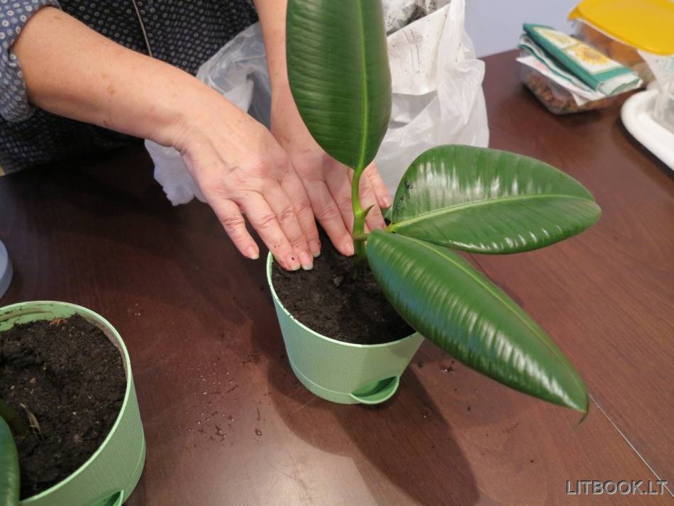 – Посадка фикуса проводится в заранее подготовленный горшок, на дно кладем слой керамзита, сажаем на том же уровне, что фикус рос ранее в горшке. Досыпаем земли и слегка утрамбовываем. После посадки – поливаем растение и при необходимости досыпаем земли до нужного уровня.