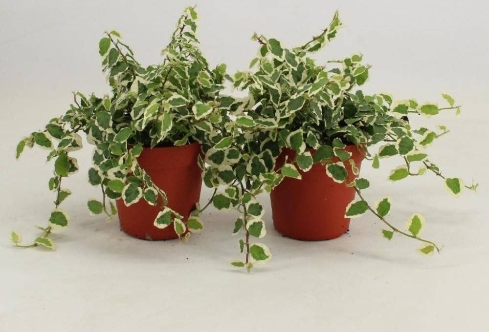 Ампельное растение – фикус карликовый или пумила. Эта стелящаяся и лазящая лиана имеет большое количество длинных и тонких побегов длиной до 5 м. Она целиком покрывает почву лиственным ковром и выпускает многочисленные корешки, которыми потом прирастает к земле. Родиной её происхождения являются Япония и Китай. Фикус карликовый имеет маленькие сердцевидной формы листья. Их длина составляет 2,5-3 см. На юных побегах формируются пластинки ассиметричной формы. И если растение размножить вегетативным способом, то этот признак передаётся взрослому цветку. У взрослых растений листья достигают 10 см длины. Среди карликовых фикусов есть пестролистные виды. Этот гибрид охарактеризовывается весьма медленным ростом. Он легче переносит нехватку света, нежели его избыток.
