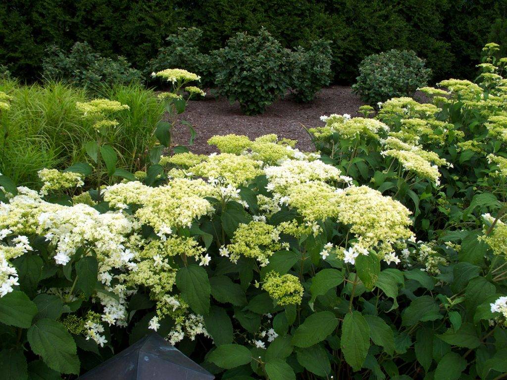 «Аннабель». Белые либо кремовые цветки собраны в шаровидные соцветия, диаметр которых достигает 20 см. Как правило, высота древовидной гортензии не превышает 1,5 м, хотя в объеме довольно быстро добирает до 3 м. В период цветения, длящийся с июня по сентябрь, стебли растения постепенно склоняются к земле, не выдерживая тяжести цветков