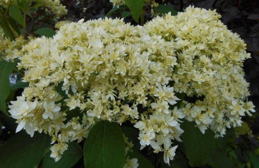 Листики крупные, имеют форму сердечка, при этом сами соцветия аккуратные, шаровидные, диаметр их может варьироваться от 15 до 30 сантиметров. Это зависит от уходовых мероприятий, а также от того, в каких территориальных и климатических условиях произрастает это растение.