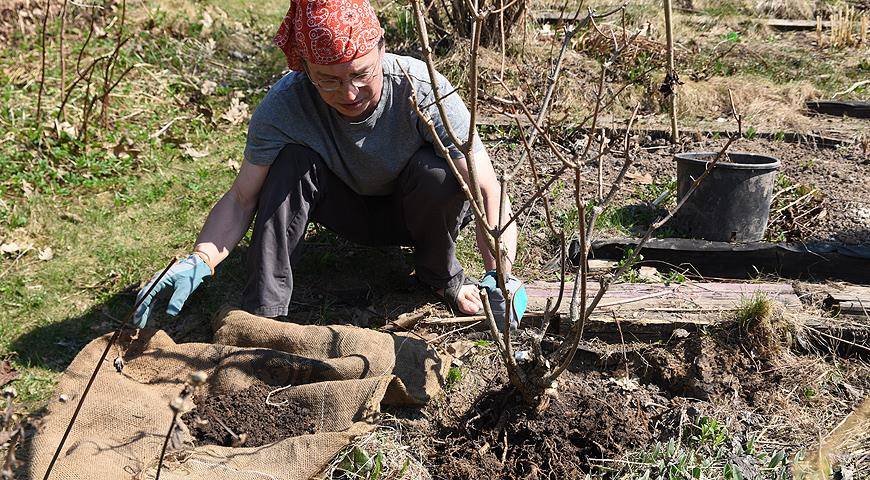 После делается углубление ширина которой будет 5 сантиметров. До того как начнут распускаться почки, надо пригнуть один побег к этой ямке, присыпать почвой и положить груз, который будет удерживать веточку.