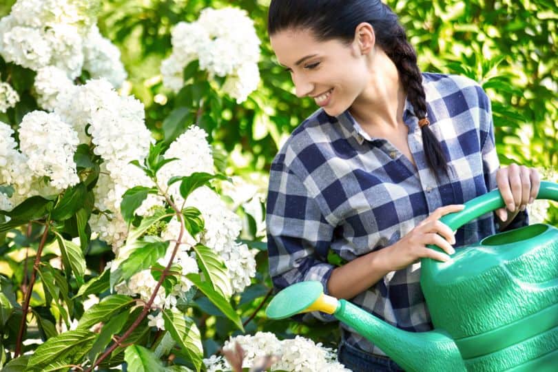 Растение очень любит влагу. Поэтому его необходимо регулярно поливать. Под один куст выливают до 5 литров воды. Полив рекомендуется проводить раз в неделю. Если цветок растет на солнечном месте, его поливают до 2 раз в неделю. Если не поливать гортензию, она погибнет