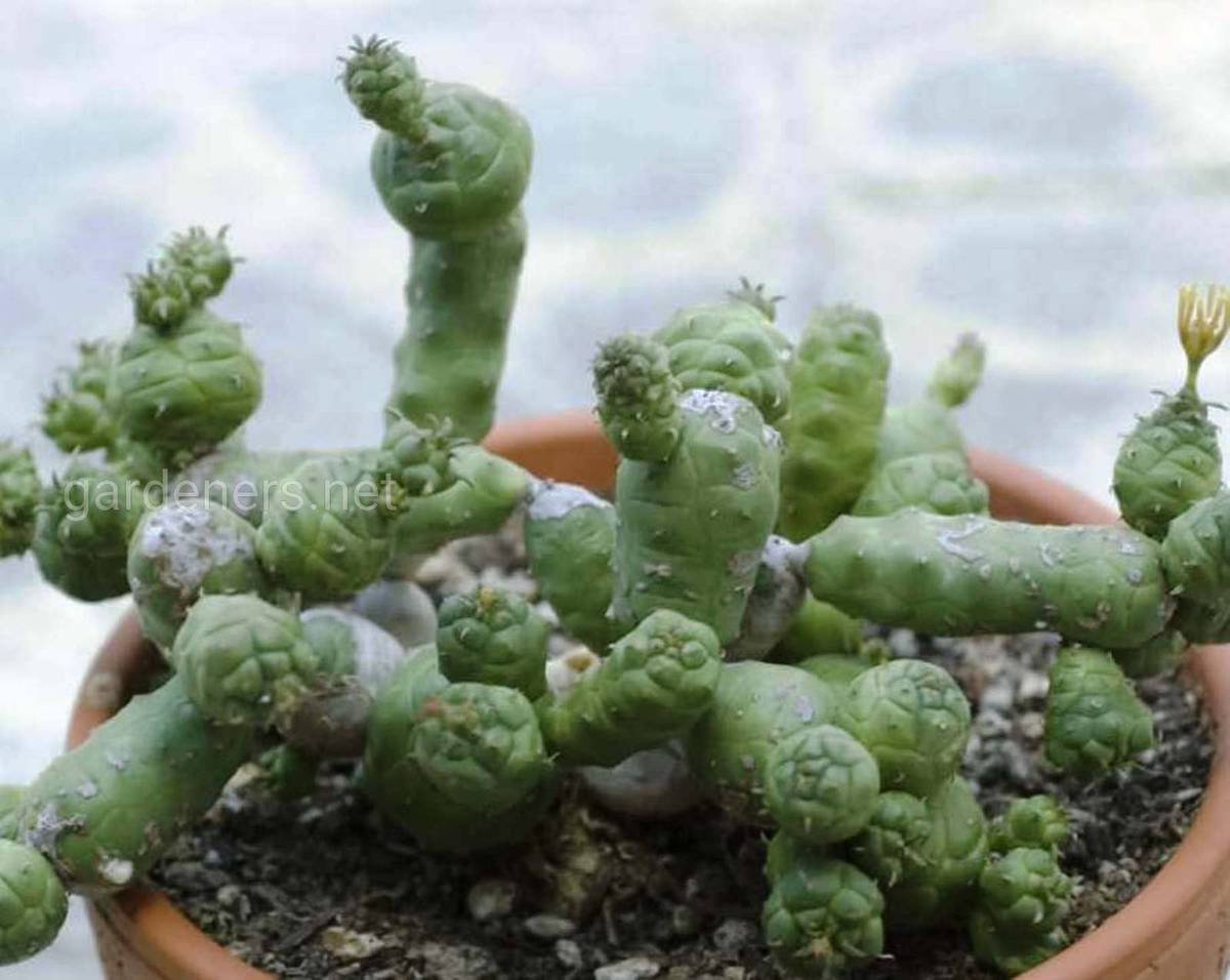 Для него лучше подобрать глубокий горшок, на 2/3 заполненный дренажем и на 1/3 смесью для суккулентов и кактусов. Любит солнечный свет, хорошо размножается черенками.