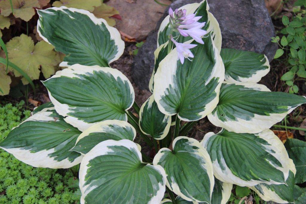 Хоста Patriot— Сердцевидные листья темно-зеленого цвета имеют широкие белые края. Светло-лавандовые цветки.