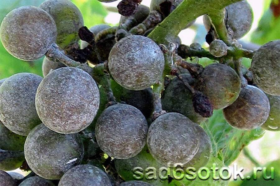 Потеря листьев ослабляет виноградный куст и снижает вкусовые качества ягод. Молодые ягоды также покрываются налетом, буреют и пропадают. Если куст заболел позже – в период роста ягод, то споры на них не образуются, но зараженные ягоды синеют и сморщиваются. У зрелых ягод появляются вдавленные бледные пятна возле плодоножки. Они сохнут и опадают.