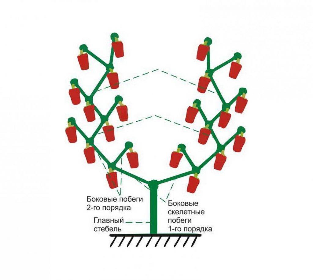 Начинать формирование нужно, когда высота перца достигает 15-20 сантиметров. В данный период на нем появляется уже более 10 листочков. Помимо этого, также начинают развиваться побеги первого порядка. Следует отметить, что их количество в большинстве случаев составляет от 2 до 4. Нам нужно оставить 2 наиболее мощные ветки – как раз из них впоследствии и будет формироваться куст. Здесь необходимо придерживаться определенной последовательности действий. В частности, рекомендуемая для формирования стебля форма – V-образная. Если все сделать правильно, здесь должны появиться ветки второго порядка, благодаря которым как раз и можно повысить урожайность.