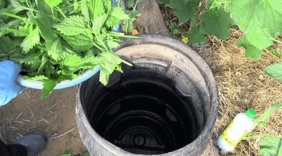 - Универсальный состав. Металлическую неокисляющую бочку или емкость из пищевого пластика устанавливают в незатененном месте, заполняют на 3/5 или 4/5 крапивой, разминают толкушкой. Заливают водой ниже краев на 8-10 см. Для ускорения процесса всыпают сахар. Чтобы не слетались насекомые и осаждалась пыль, закрывают полиэтиленом. Вымешивают каждые 2 дня. Как только брожение прекратилось, цвет содержимого емкости стал насыщенным коричневым, а запах резким, неприятным «силосным», можно использовать.