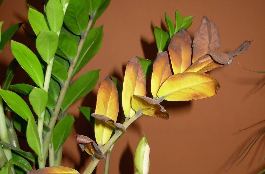 Обратите внимание! Частое пересыхание грунта при выращивании замиокулькуса также не приведет ни к чему хорошему. Если верхушка и листья начали желтеть, а почва давно уже сухая, значит, растению не хватает влаги