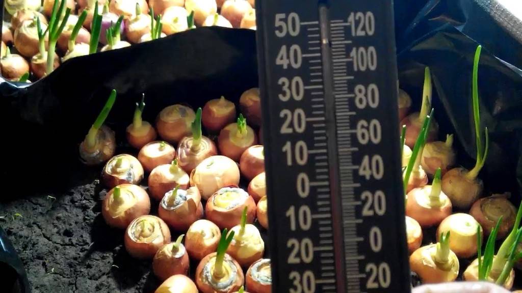 Лук относится к холодостойким культурам и не переносит жару. При 30°C он перестаёт расти. В зимний период не допускают перегрева грунта от отопительных приборов, а весной и летом — от солнца. Оптимальная температура для роста зелени 18–25°C.