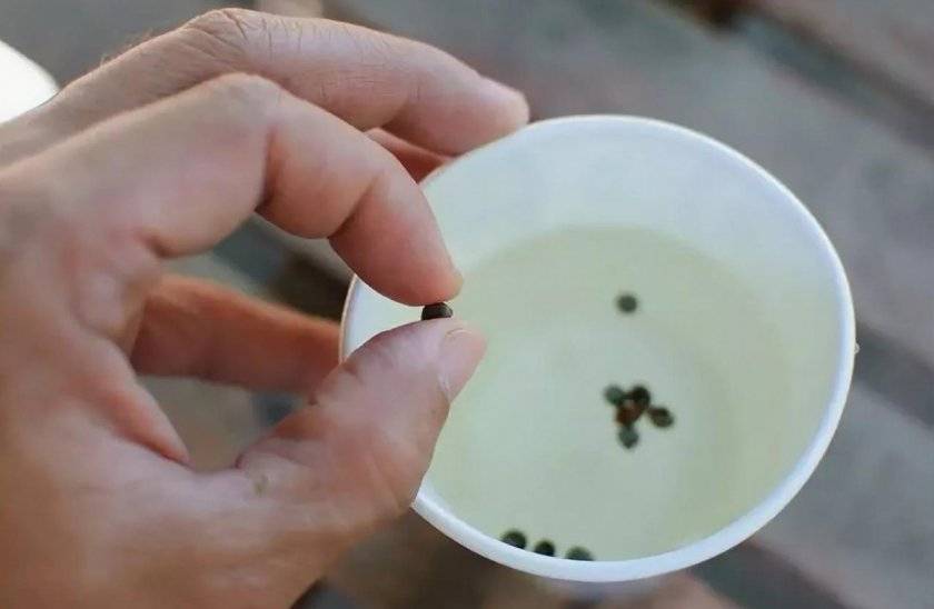 - Провести калибровку, то есть, отсеивание плохих семян, которые невозможно увидеть только при внешнем осмотре. Для этого вам понадобится баночка с соленой водой (сорок грамм соли на литр воды) — всыпьте в нее горсть проверяемого сырья, подождите около получаса, выбросьте всплывшие семена.