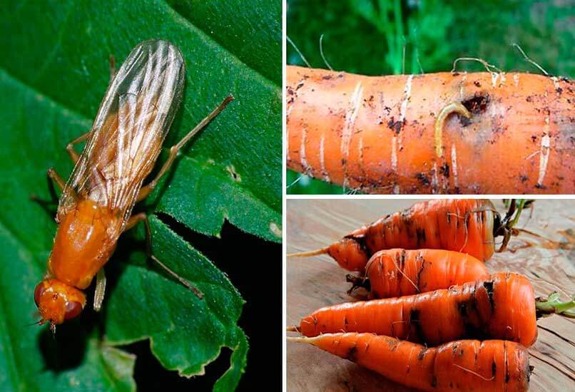 Главный вредитель, способный самостоятельно уничтожить весь урожай – морковная муха. Она отличается от обычных мух тем, что ее личинки прорывают ходы и лабиринты в почве, чтобы добраться до своей основной пищи – плодов моркови. Такие овощи, поеденные и изрытые личинками, в пищу непригодны. Урожай придется просто выбросить.