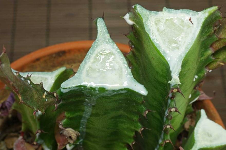 У достаточно высокого растения срезают верхушку и сразу же промокают выделяющийся млечный сок сухой салфеткой, чтобы он не растекался по стеблю, оставляя после подсыхания некрасивые следы. Место среза припудривают порошком древесного угля во избежание попадания различного рода инфекций.