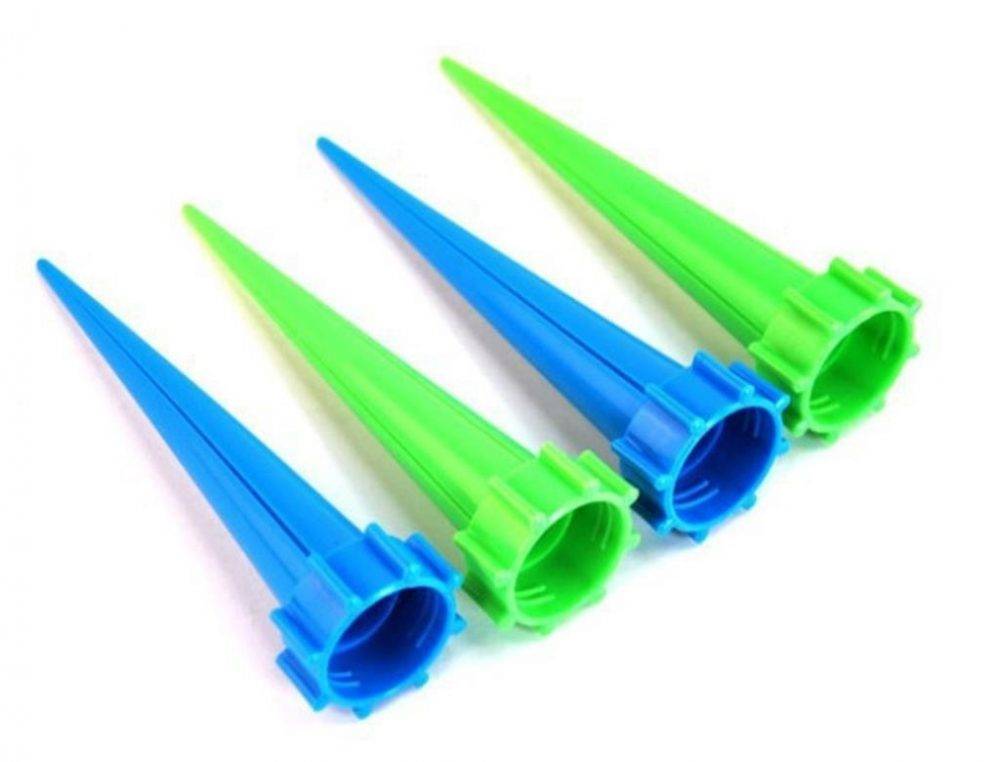 Емкость с такой насадкой переворачивают горлышком вниз и вставляют в землю на некотором расстоянии от стебля растения.
