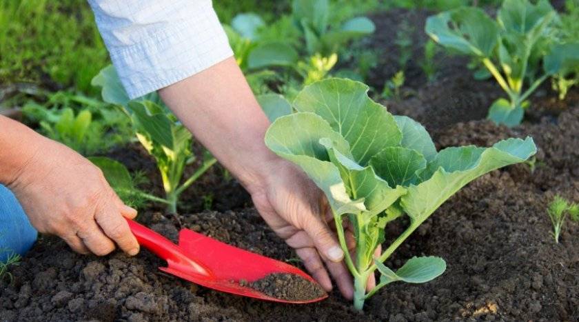 Через 18–20 дней после высадки в грунт капусту в первый раз окучивают. Ещё через 10–12 дней повторяют процедуру. При окучивании вы засыпаете стебель землёй, побуждая его к формированию новых корней. Капуста сможет усвоить из почвы больше питательных веществ.