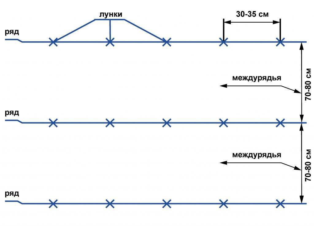 - рядами с расстоянием между кустами 25-30 см и шириной междурядий 50-70;