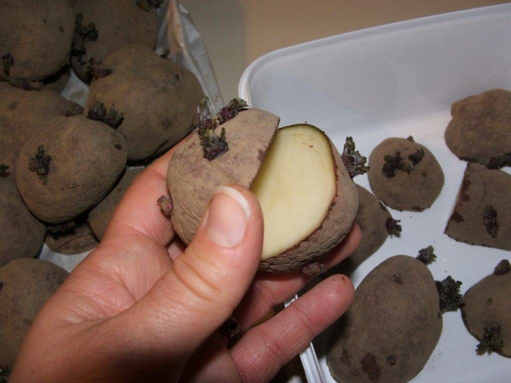 Если для посадки используются более крупные клубни, для экономии можно разрезать их на несколько частей, на каждой из которых должно быть несколько ростков. Удобнее всего делать это в начале проращивания, когда глазки уже проснулись, но ростки ещё маленькие. После каждого клубня нож дезинфицируют спиртом или раствором марганцовки. Срезы посыпают древесной золой. Резку клубней проводят не позднее, чем за неделю до высадки, чтобы срезы успели покрыться защитной корочкой. На переувлажнённых участках этот способ не используют из-за повышенного риска загнивания резаных клубней.