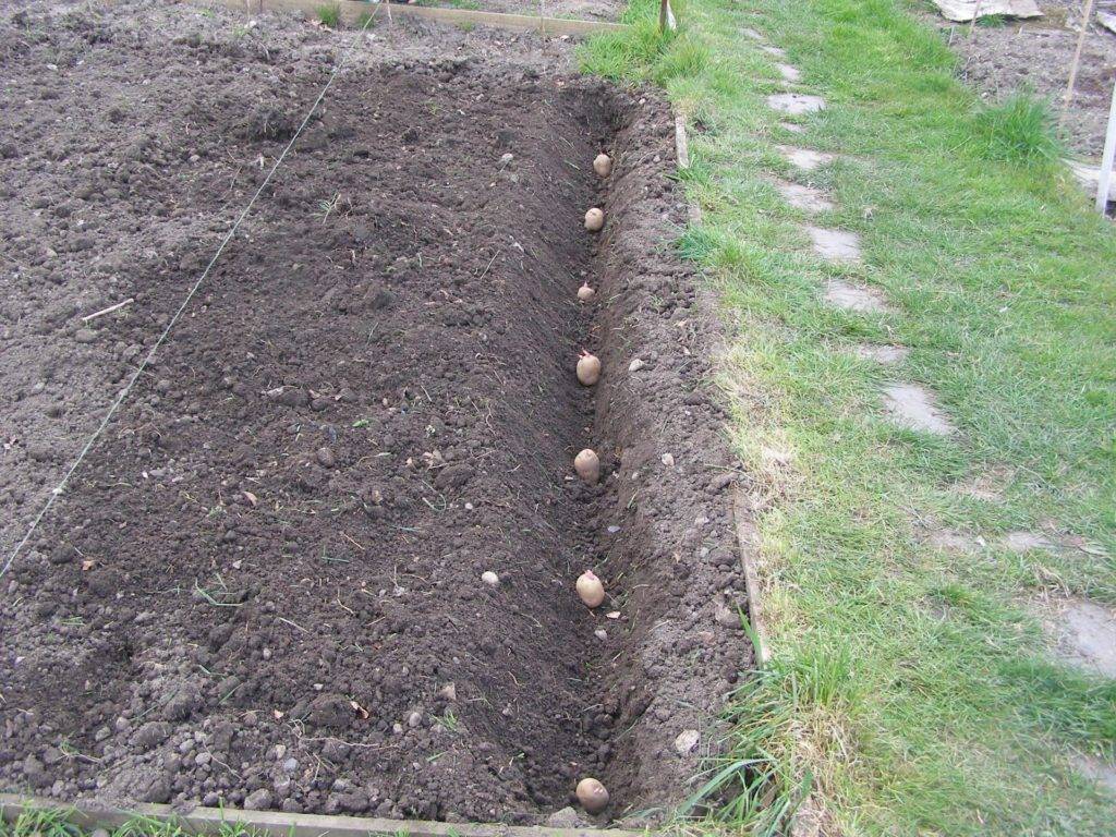 На предварительно перекопанном участке с помощью двух колышков и шнура размечают ряды на расстоянии 70 сантиметров друг от друга. «Под шнур» копают канавки глубиной 10–15 сантиметров. В канавки раскладывают пророщенные картофелины на расстоянии около 30 сантиметров одна от другой