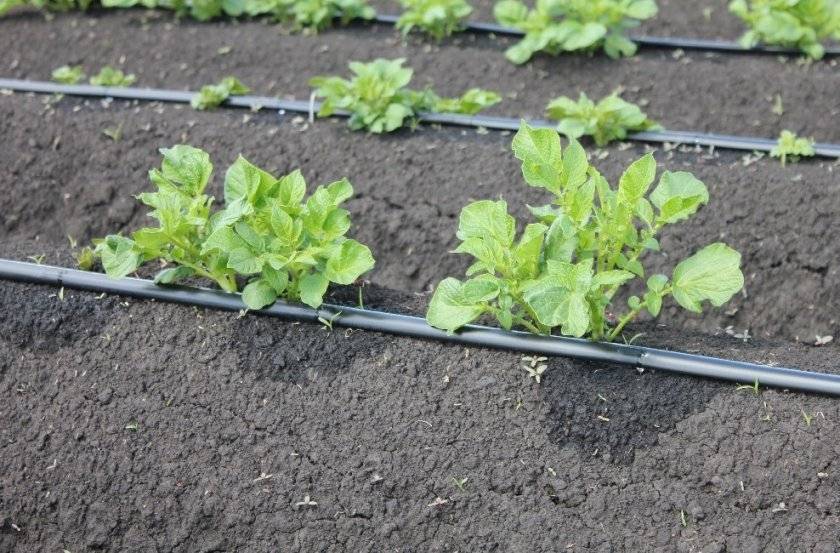 Картофель спокойно переносит незначительную нехватку влаги, но постоянная засуха для него губительна. В условиях жаркого лета необходимо организовать капельный полив или дождевание. В крайнем случае посадки поливаются вручную, с промачиванием почвы на 50 см.