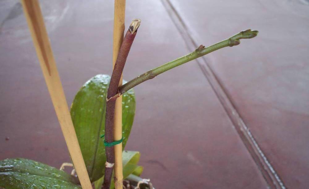 Если орхидея фаленопсис отцвела, что делать с цветоносом? Опытные орхиеводы не спешат удалять его полностью. Если внимательно осмотреть нижнюю часть цветоноса, всегда можно обнаружить 2–3 спящие почки, прикрытые чешуей. Цветонос срезают на 1–1,5 см выше верхней из них, срез обрабатывают садовым варом. Спустя некоторое время из спящей почки формируется боковой цветонос, правда, цветы в его соцветии гораздо мельче, чем у отцветшего. Молодые орхидеи желательно не стимулировать к повторному цветению, чтобы не ослаблять растение. Иногда, довольно редко, на верхушке отцветшего цветоноса образуются детки.
