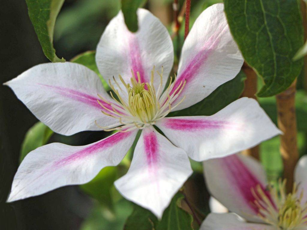 У Клематисов этого вида крупные и очень красивой окраски цветы, чашелистики снежно-белого цвета, по центру лепестка проходит яркая розовая полоса. Центр цветка украшает корона из золотистых крупных тычинок. В саду лиана прекрасно себя чувствует на притененной местности и будет радовать длительным цветением. Цветы очень крупные, в диаметре могут достигать порядка 16 см. На молодых побегах с наступлением тепла образовываются одиночные цветки, а на перезимовавших растениях – многочисленные и крупные.