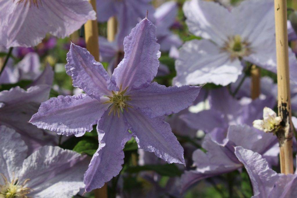 Фото клематиса Голубой Ангел (Блекитни Аниол) подтверждают обильное цветение, но вряд ли смогут передать всю нежную красоту цветов. Лепестки у клематиса от небесно-голубого до светло-сиреневого цвета. На солнце они словно переливаются. В период цветения клематис Блекитни Аниол похож на нежное, воздушное облако.