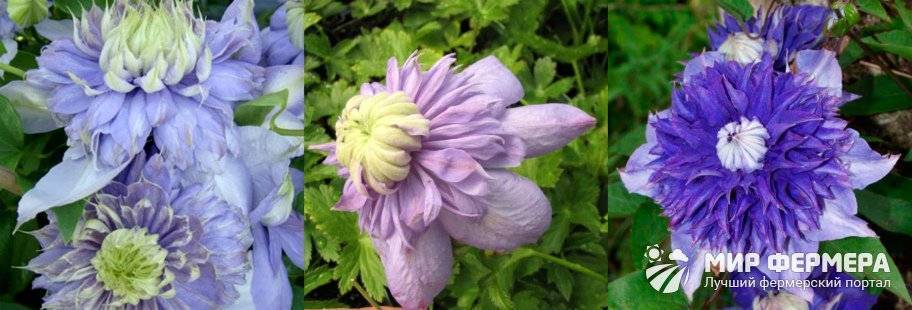 Цветение начинается в мае-июне, повторное, менее обильное – в июле и может продолжаться до холодов. Цветки крупные, 11…15 см в поперечнике, всегда махровые, полумахровые или простые. Чашелистиков 6, остальное стаминодии. Формирующие цветок стаминодии и чашелистики светло-сиреневые или голубовато-сиреневые (иногда почти голубые), стаминодии в середине цветка кремово-желтые.