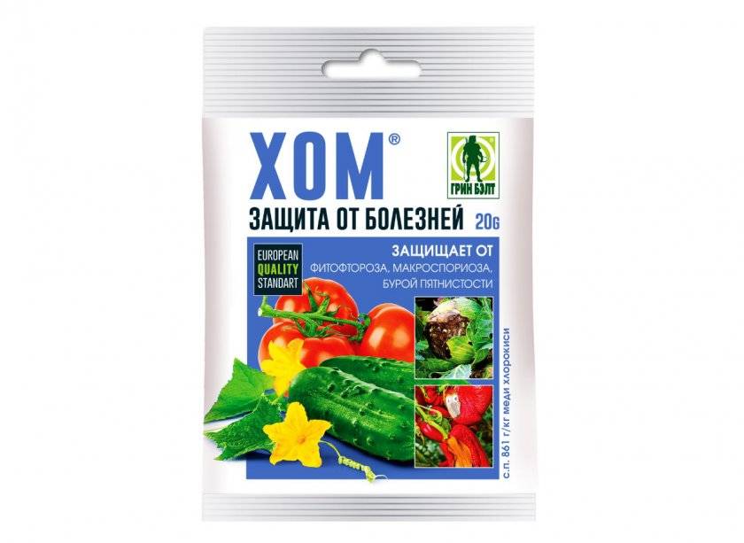 «Хом» — порошок зелёного цвета, который используют для защиты паслёновых культур от фитофторы и альтернариоза помидоров. Также его часто применяют для защиты растений от ряда грибковых заболеваний, поскольку его воздействие во многом схоже с бордоской жидкостью. Приобрести «Хом» можно в упаковках по 20 и 40 г в специализированных магазинах, а для промышленных масштабов его продают коробками по 10–15 кг.