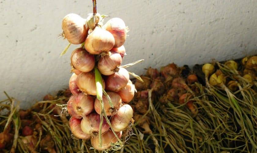 Для лучшего хранения в квартире, можно заплести «косу». Такую манипуляцию проделывают после сушки, проверяют на наличие подгнивших луковиц, удаляют их. В таком виде его хранят до заморозков в дачном домике, а потом перевозят в дом. Температурный режим до +25°С.