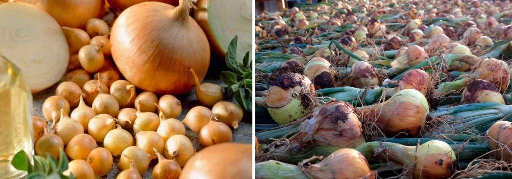 Уборка урожая лука происходит тогда, когда жёлтое перо полностью легло и высохло. Выкопанные гроздья просушивают на солнце или под навесом на открытом воздухе. Вытягивать лук из земли категорически не рекомендуют, можно только подкапывать лопатой. Сортировка и очистка от корешков и лишних листьев – следующая процедура. От листьев оставляют пенёк в три сантиметра.    Отбракованный и не успевший созреть лук пускают на еду и в переработку.