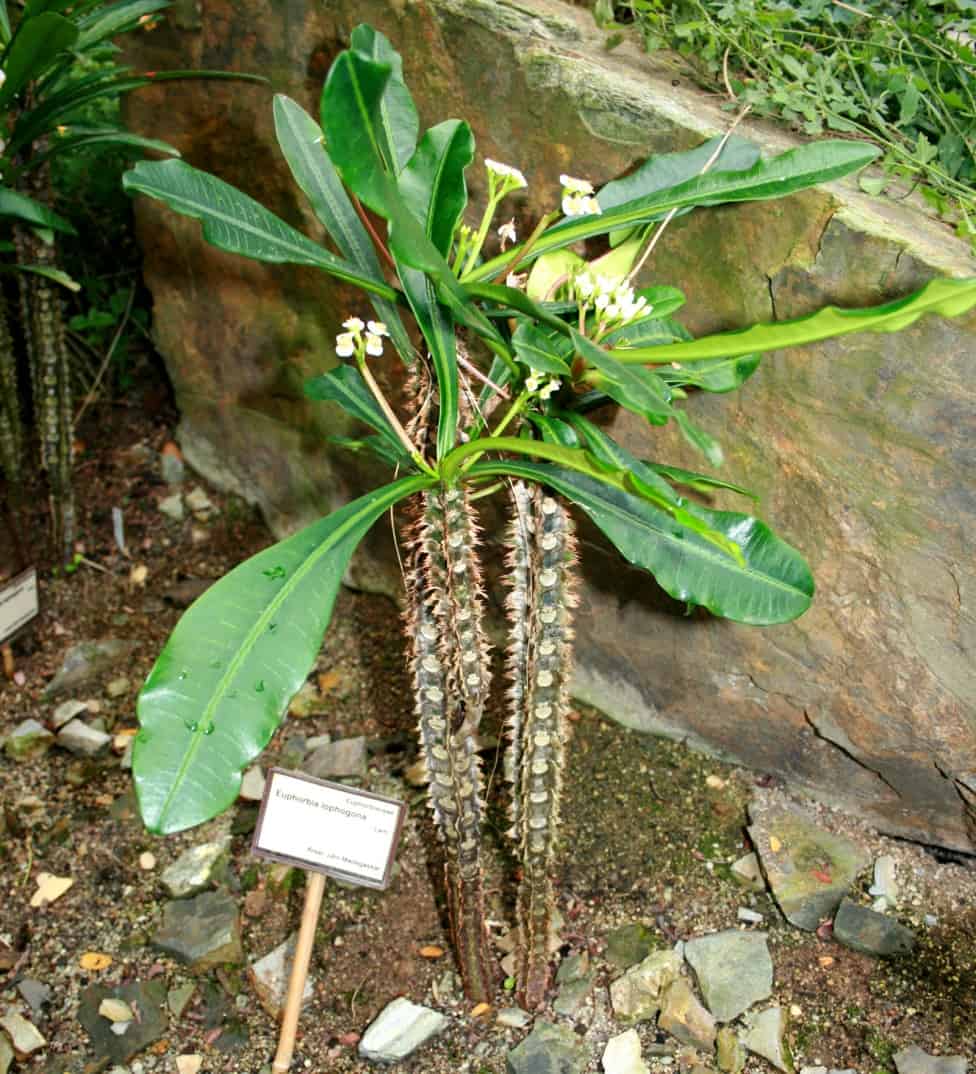- Треугольный. Суккулентный кустарник, достигающий высоты до 2 м. Мощные стебли с небольшими буграми плотно прижаты друг к другу, имеют три характерные грани. На них находятся небольшие лопатовидные листья длиной до 3 см. Цветение в домашних условиях невозможно;