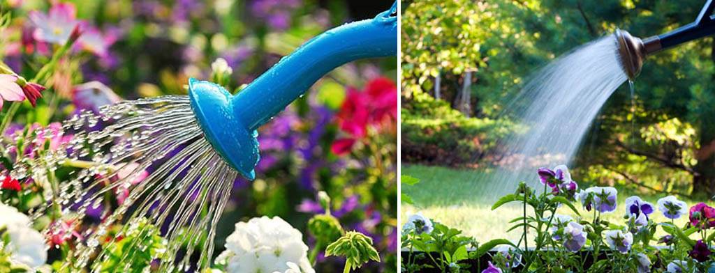 Вследствие летучести аммиака опрыскивание растений нашатырным спиртом лучше проводить из лейки, дающей струйки с видимыми брызгами (слева на рис.) по общим правилам: на закате после полива или, в пасмурную погоду, с утра сразу после рассвета. Для обработки плодов или больших площадей опрыскиватель нужно переключить с тумана на брызги. Если пользоваться «крутой» лейкой, дающей морось (справа на рис.), то большая часть действующего вещества будет потеряна уже в воздухе.