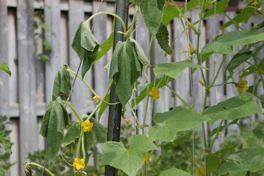 Несмотря на наличие усиков, огурцы необходимо подвязывать. Природные «приспособления» для закрепления подсыхают через 1-1,5 месяца, и растение, вместе со сформировавшимися плодами, окажется на земле. Влажная среда — идеальные условия для начала гниения.