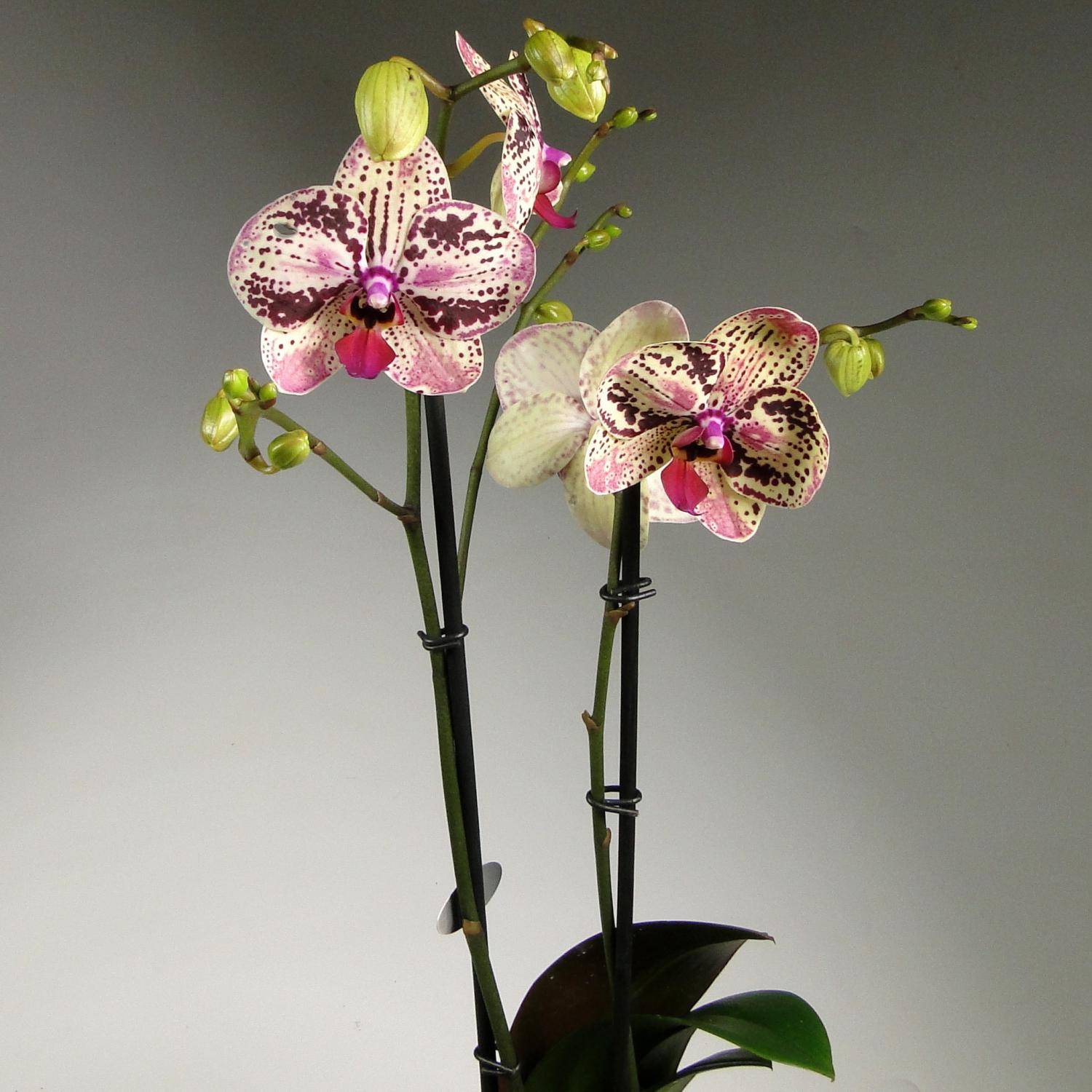 Крупные цветоносы фаленопсиса нуждаются в опоре. Растение привязывают к ней в нескольких местах для сохранения равновесия.