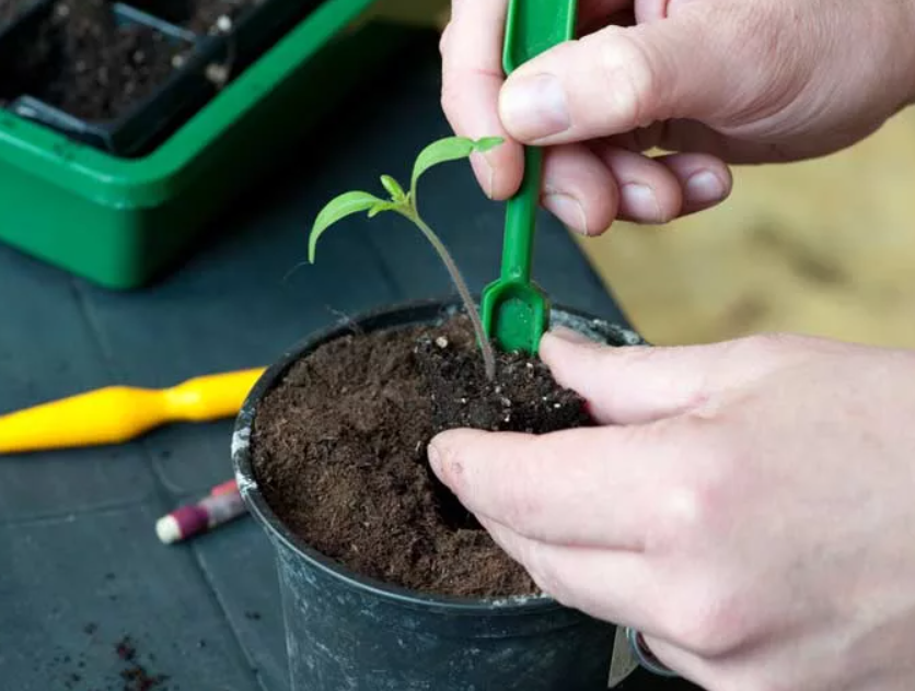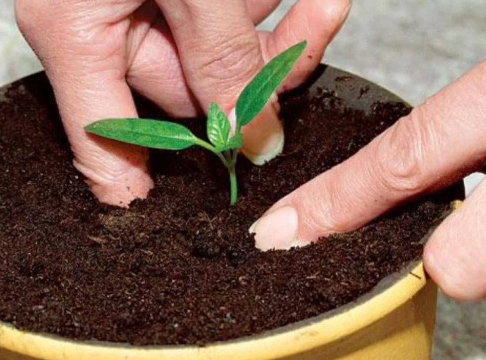 - В горшочке, куда будет пересажен росток, делают углубление, его стенки уплотняют пальцем или палочкой