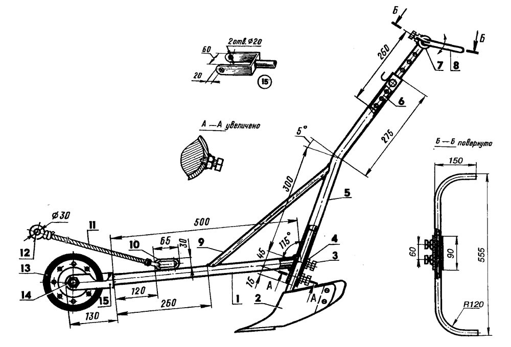 Теперь остановимся на наших рукодельцах. В связи с участившейся потребностью ручных плужков, их начали выпускать чуть ли не на каждом заводе. Конструкции такого изделия у всех практически идентичны и предназначены для использования в качестве тягла великовозрастного дитяти, который на сотке и физразминку сделает, и родителям поможет. Выглядит это так: