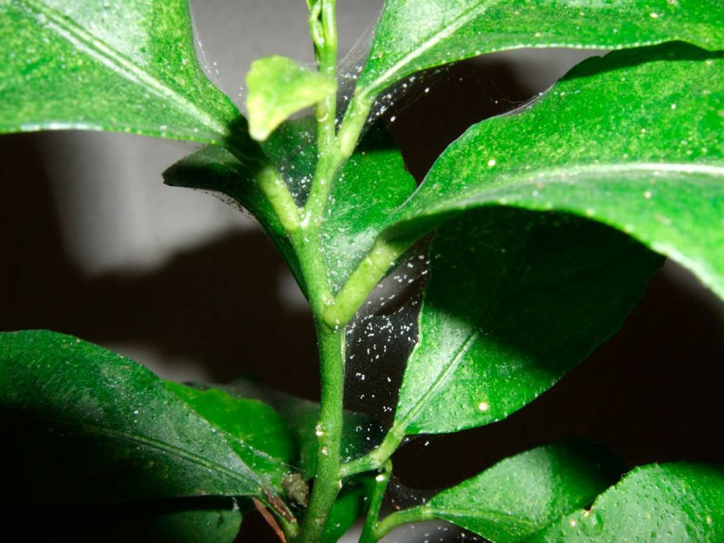В первую очередь обратите внимание на листовые пластины — они покрываются мелкими белыми точками. Остальная наземная часть фикуса покрывается тонкой паутиной.При этом цветок: