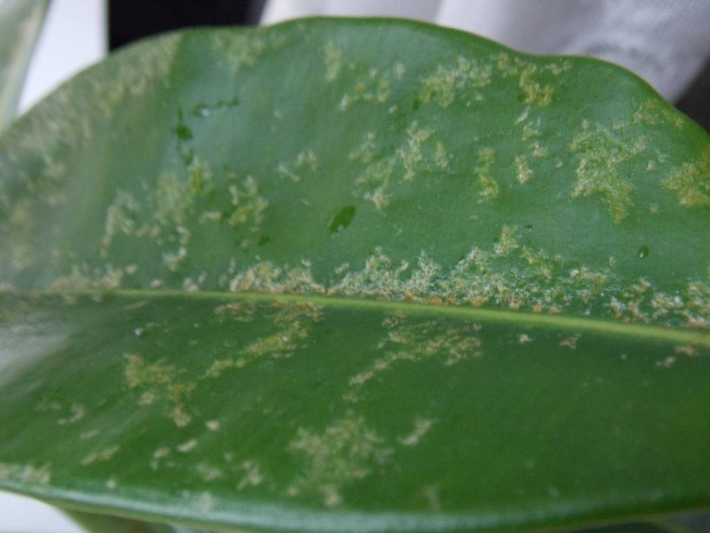 Внимательно осмотрите нижнюю сторону листа. Паутинный клещ выглядит как маленькие белые крупинки, размером меньше манной крупы. При сильном поражении появляется паутина. На внешней стороне листа также видны следы присутствия клеща – лист обесцвечивается в тех местах, где клещ питался соком.