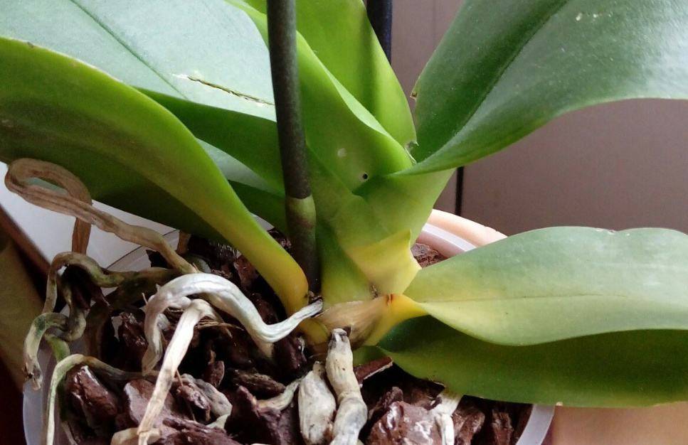 Пожелтение листиков у основания может сигнализировать о загнивании либо пересыхании корневой системы. И такая проблема требует срочного разрешения. К загниванию корневищ может привести наличие грибковой инфекции. Тогда орхидею необходимо экстренно пересадить, а корни обработать фунгицидами. Высыхание корешков зачастую связано с нехваткой влаги вследствие уплотнения субстрата. Все проблемы, связанные с изменениями корневой системы требует срочного и незамедлительного решения.