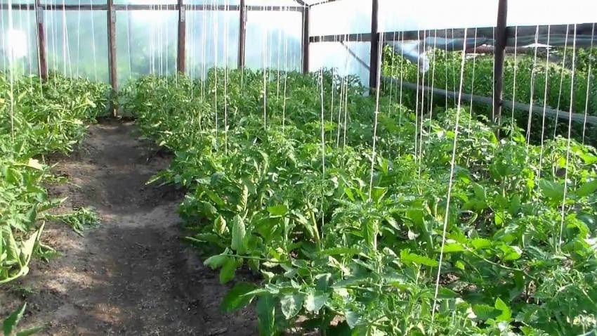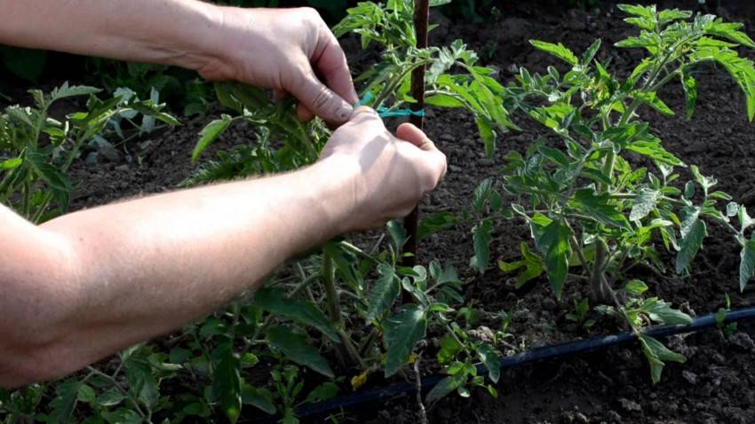 Первая подвязка растений требует большей аккуратности, чтобы правильно разместить стебли в ряду.