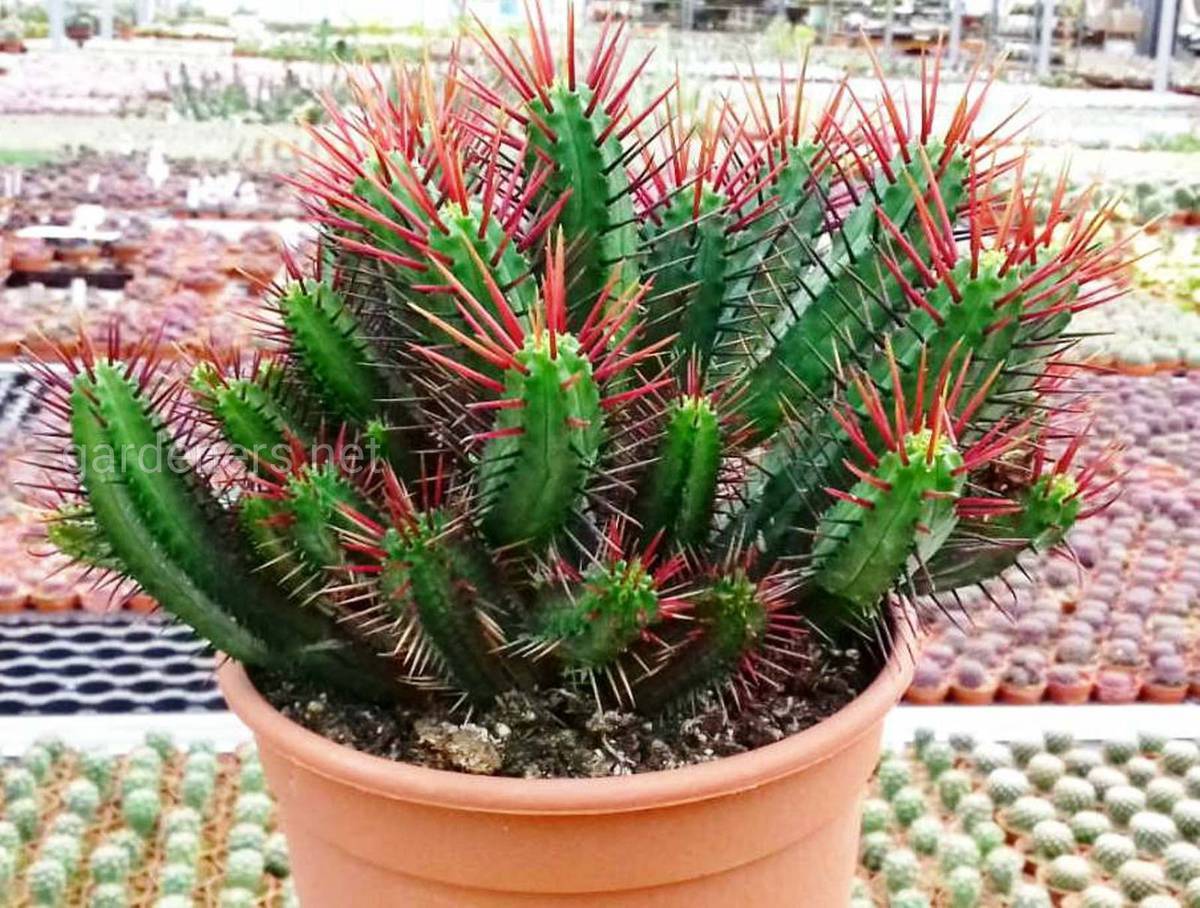 Он же молочай блестящий. Является сильноветвящимся суккулентом, имеющим эллиптические листья и множество толстых конических иголок. Может цвести, цветки бывают желтые, оранжевые, белые, розовые и др.