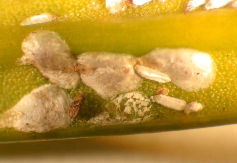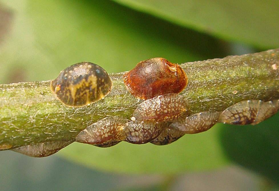 Полушаровидная ложнощитовка (Saissetia coffeae) – названа по форме плоско-выгнутого щитка, достигающего в длину 4 мм, гладкого и цветом от темно-коричневого до черноватого. После созревания яиц самка погибает, панцирь приподнимается, и личинки расползаются очень быстрыми темпами по листку или стеблю.