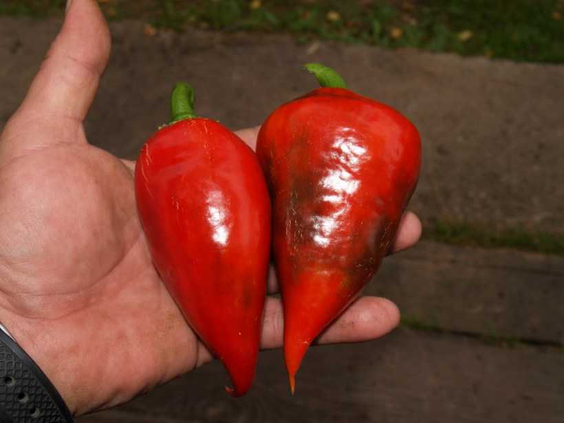 Плоды длиной от 18 до 20 см, по форме конусовидные, сильноглянцевые. Когда только начинают поспевать приобретают зелёный цвет, который потом меняют на красный. В диаметре перчики от 13 до 15 см, отличаются толстыми стенками – около 9 мм.