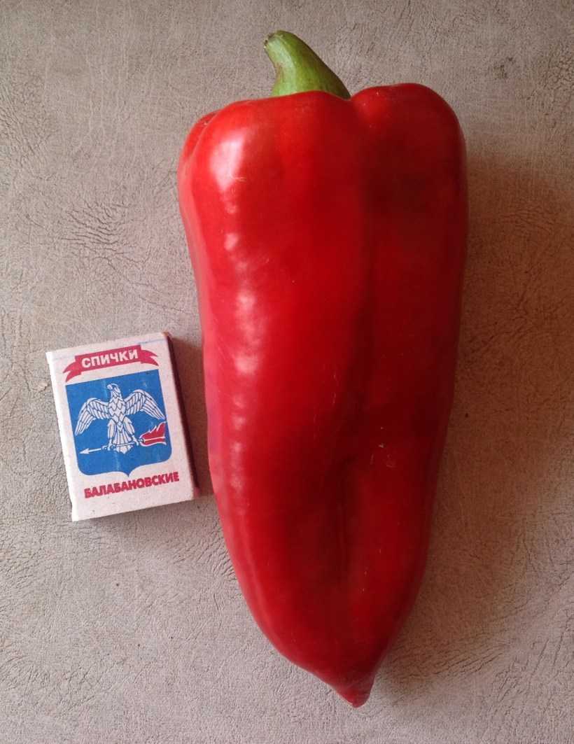 Плоды этого сорта — крупные, слегка удлиненные кубы. Отдельные экземпляры из тепличного урожая достигают 20 см и массы 400 г (при грамотной формировке куста). В среднем перцы мельче, но урожайность растения все равно находится на высоком уровне. Плоды состоят из 3-4- гнезд. У них толстые стенки. У самых больших — до 1 см, в среднем — 6-8 мм.